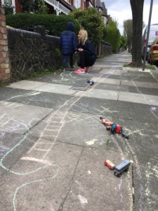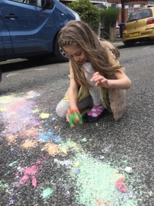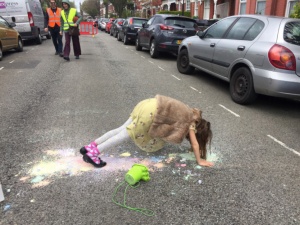 Every time, with the same raw materials of chalk, a road, and a few other bits and pieces, the kids find something to do they’ve never done before. Below is an installation created by strategically placing chalk to be crushed by residents’ cars as they are guided in and out of the street. More crushing was administered by a stegosaurus (although other dinosaurs can also be used) and the artist was so miffed about a shower of rain that she tried to protect her creation by doing a plank on top of it.